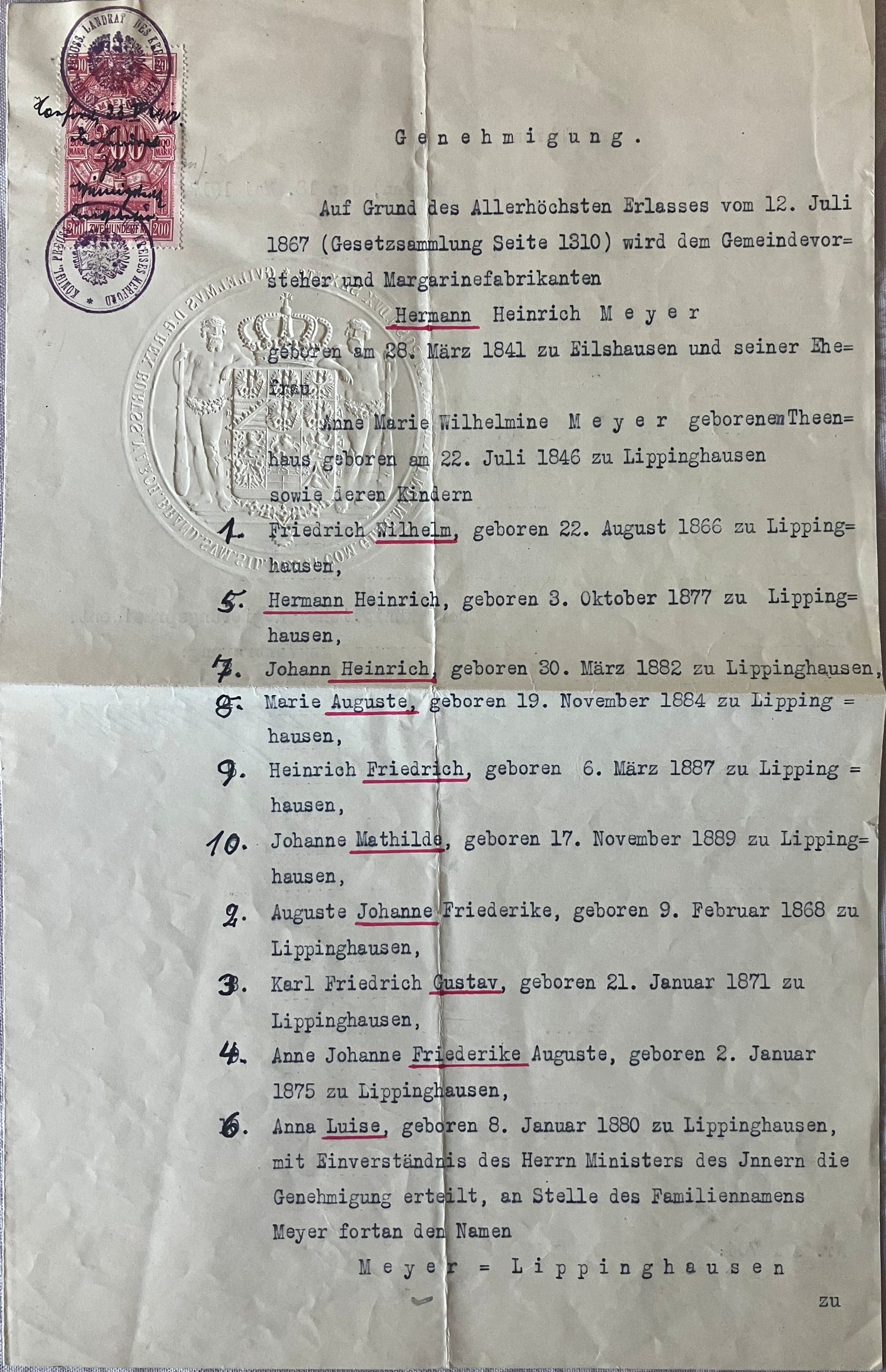 Im Jahre seiner Goldenen Hochzeit wurde am 18. Mai 1917 aufgrund seiner Verdienste für die Gemeinde Lippinghausen durch den Vertreter des Königlichen Regierungspräsidenten „Auf Grund des Allerhöchsten Erlasses vom 12. Juli 1867 dem Gemeindevorsteher und Margarinefabrikanten Hermann Heinrich Meyer und seiner Ehefrau Anne Marie sowie deren Kindern mit Einverständnis des Herrn Ministers des Inneren die Genehmigung erteilt, an Stelle des Familiennamens Meyer fortan den Namen Meyer-Lippinghausen zu führen“, heißt es wörtlich in der Originalurkunde.